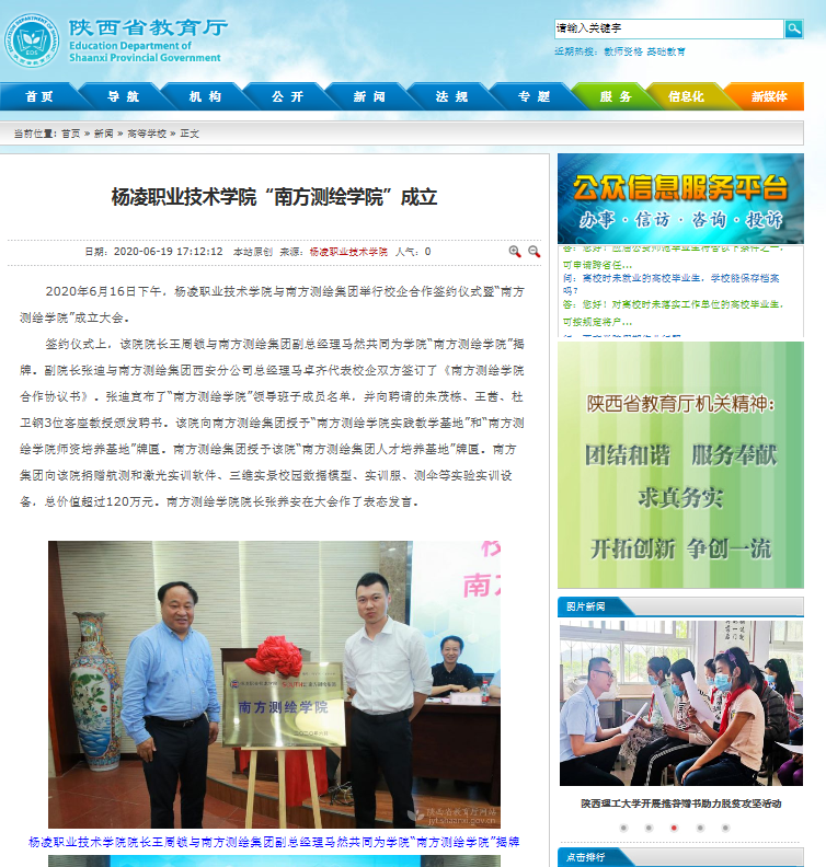 2020年6月16日下午,杨凌职业技术学院与南方测绘集团举行校企合作签约仪式暨“南方测绘学院”成立大会。