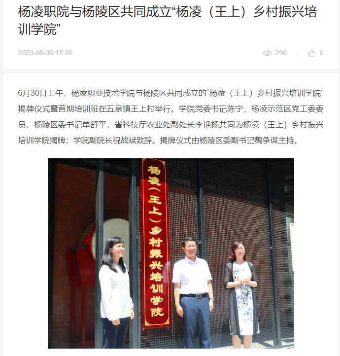 此次杨凌职院与杨陵区共同成立“杨凌(王上)乡村振兴培训学院”,旨在充分发挥职教优势,进一步推进区校深度融合,打通高校、政府、乡村产业之间的天然阻隔,把科教力量延伸输送到田间地头,立足乡村振兴战略总要求,围绕农业强、农村美、农民富,扎实推进“五大振兴”。杨凌(王上)乡村振兴培训学院一是将面向杨陵区内外村干部、职业农民、新型经营主体、退役军人等,采用工学结合、育训结合等形式,通过百万扩招、函授教育、现代远程教育等方式进行学历提升教育;二是将面向杨陵区内外组织开展村干部、高素质农民、基层农技员、涉农企业、农业经理人、农业合作社、农文旅等相关从业人员的职业技能提升、职业素养培育等各类培训,聚力打造独具杨凌特色的乡村振兴模式,助推区域经济高质量发展。