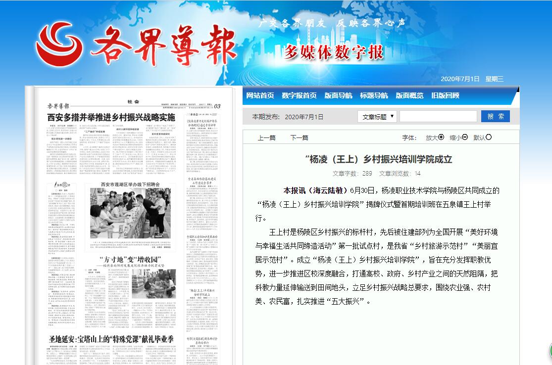 王上村是杨陵区乡村振兴的标杆村,先后被住建部列为全国开展“美好环境与幸福生活共同缔造活动”第一批试点村,是我省“乡村旅游示范村”“美丽宜居示范村”。成立“杨凌(王上)乡村振兴培训学院”,旨在充分发挥职教优势,进一步推进区校深度融合,打通高校、政府、乡村产业之间的天然阻隔,把科教力量延伸输送到田间地头,立足乡村振兴战略总要求,围绕农业强、农村美、农民富,扎实推进“五大振兴”。