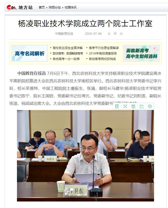 中国教育在线讯 7月6日下午,西北农林科技大学支持杨凌职业技术学院建设高水平高职院校推进大会在西北农林科技大学南校区举行。西北农林科技大学党委书记李兴旺,校长吴普特,中国工程院院士康振生、张涌,副校长马建华;杨凌职业技术学院党委书记陈宁,院长王周锁,党委副书记任得元,党委副书记、纪委书记刘粉莲,副院长张迪、祝战斌出席大会。大会由西北农林科技大学党委副书记吕卫东主持。
