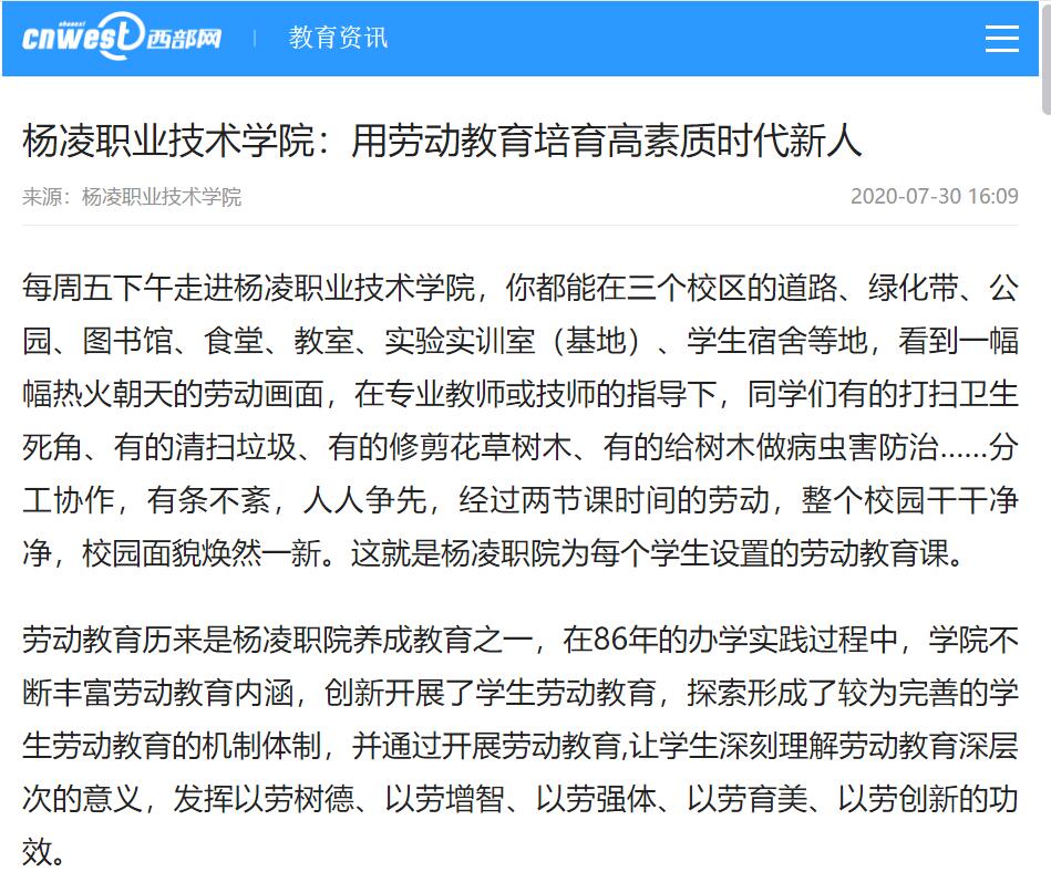 杨凌职院在总结近年来学生劳动课教育工作成效的基础上,结合学院实际,下发了《杨凌职业技术学院关于进一步加强学生劳动教育的意见》和《杨凌职业技术学院劳动课实施办法(试行)》,并在《办法》中规定,劳动课属于学院“四位一体”人才培养方案中行为养成课范畴,是各专业学生的一门必修课程,与其他课程同向同行,成绩合格方能毕业。