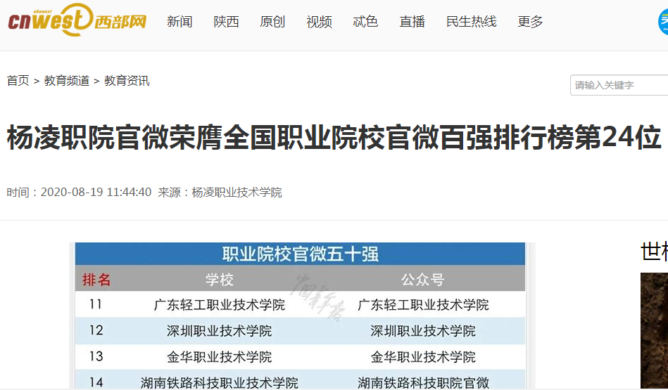 上一条:【群众新闻网】喜讯!杨凌职院官微荣膺全国职业院校官微百强排行榜第24位