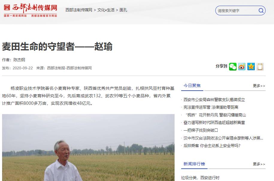 杨凌职业技术学院著名小麦育种专家、陕西省优秀共产党员赵瑜,扎根扶风豆村育种基地60年,坚持小麦育种研究至今,先后育成武农132、武农99等五个小麦品种,省内外累计推广面积8000多万亩,实现农民增收48亿元。