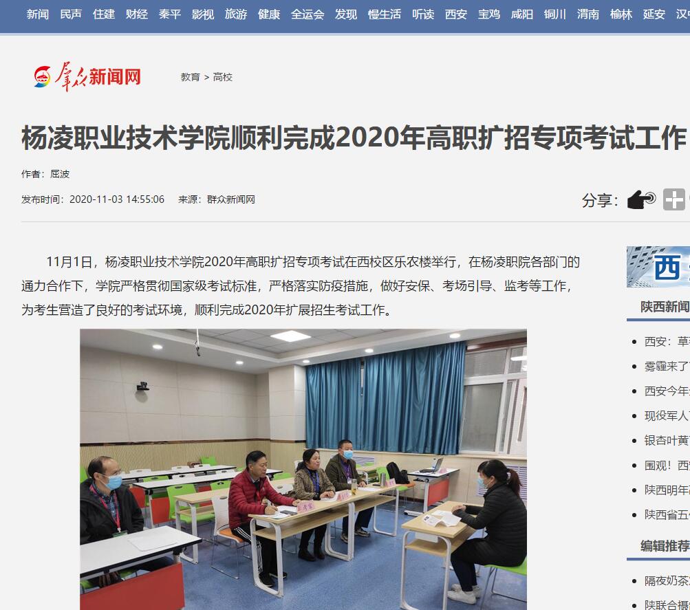 11月1日,杨凌职业技术学院2020年高职扩招专项考试在西校区乐农楼举行,在杨凌职院各部门的通力合作下,学院严格贯彻国家级考试标准,严格落实防疫措施,做好安保、考场引导、监考等工作,为考生营造了良好的考试环境,顺利完成2020年扩展招生考试工作。