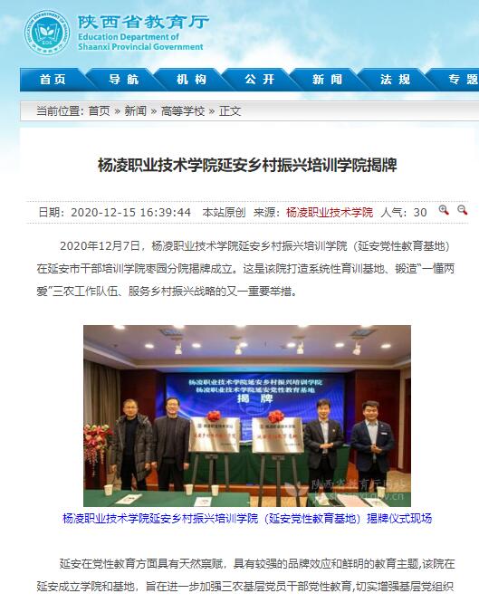 2020年12月7日,杨凌职业技术学院延安乡村振兴培训学院(延安党性教育基地)在延安市干部培训学院枣园分院揭牌成立。这是该院打造系统性育训基地、锻造“一懂两爱”三农工作队伍、服务乡村振兴战略的又一重要举措。