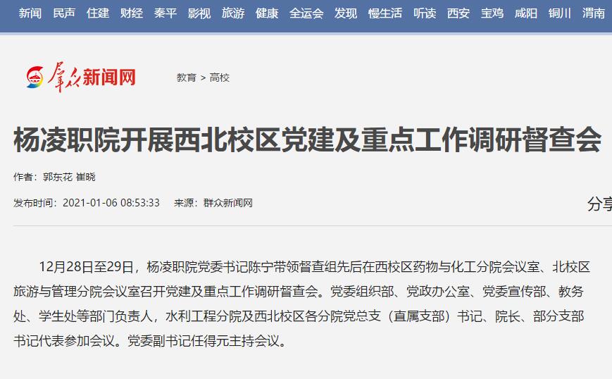 12月28日至29日,杨凌职院党委书记陈宁带领督查组先后在西校区药物与化工分院会议室、北校区旅游与管理分院会议室召开党建及重点工作调研督查会。党委组织部、党政办公室、党委宣传部、教务处、学生处等部门负责人,水利工程分院及西北校区各分院党总支(直属支部)书记、院长、部分支部书记代表参加会议。党委副书记任得元主持会议。
