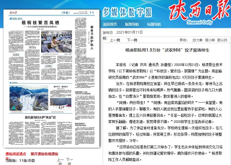 本报讯 (记者 齐卉 通讯员 孙建恒)2020年12月21日,杨凌职业技术学院(以下简称杨凌职院)以“科技饺、爱农馅、家国情”为主题,用赵瑜研究员培育的“武农986”小麦制作的面粉包出1.5万份饺子宴请师生。