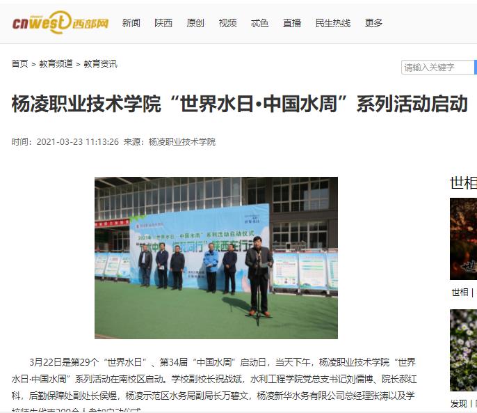 3月22日是第29个“世界水日”、第34届“中国水周”启动日,当天下午,杨凌职业技术学院“世界水日·中国水周”系列活动在南校区启动。学校副校长祝战斌,水利工程学院党总支书记刘儒博、院长郝红科,后勤保障处副处长侯煜,杨凌示范区水务局副局长万碧文,杨凌新华水务有限公司总经理张涛以及学校师生代表200余人参加启动仪式。