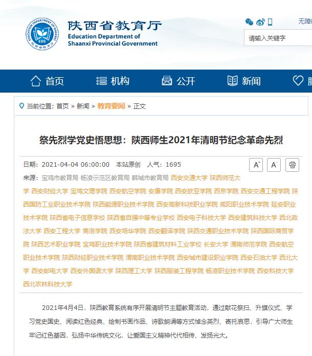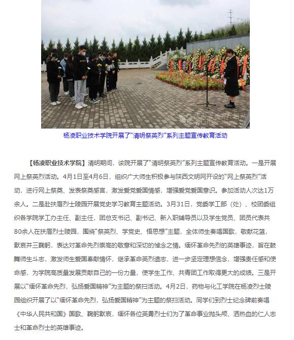 【杨凌职业技术学院】清明期间,该院开展了“清明祭英烈”系列主题宣传教育活动。一是开展网上祭英烈活动。4月1日至4月6日,组织广大师生积极参与陕西文明网开设的“网上祭英烈”活动,进行网上祭奠、发表祭奠感言,激发爱党爱国情感,增强爱党爱国意识。参加活动人次达1万余人。二是赴扶眉烈士陵园开展党史学习教育主题活动。3月31日,党委学工部(处)、校团委组织各学院学工办主任、副主任,团总支书记、副书记、新入职辅导员以及学生党员、团员代表共80余人在扶眉烈士陵园,围绕“祭英烈、学党史、悟思想”主题,全体师生奏唱国歌,敬献花篮,默哀并三鞠躬,表达对革命先烈崇高的敬意和深切的悼念之情。缅怀革命先烈的英雄事迹,旨在鼓舞师生斗志,激发师生爱国奉献情怀,继承革命英烈遗志,进一步坚定理想信念,增强责任感和使命感,为学院高质量发展贡献自己的一份力量,使学生工作、共青团工作取得更大的成绩。三是开展以“缅怀革命先烈,弘扬爱国精神”为主题的祭扫活动。4月2日,药物与化工学院在杨凌烈士陵园组织开展了以“缅怀革命先烈,弘扬爱国精神”为主题的祭扫活动。同学们到烈士纪念碑前奏唱《中华人民共和国》国歌、鞠躬默哀,缅怀各位英勇烈士们为了革命事业抛头颅、洒热血的仁人志士和革命烈士的英雄事迹。