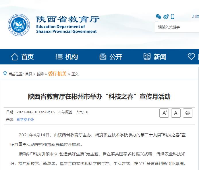 2021年4月14日,由陕西省教育厅主办、杨凌职业技术学院承办的第二十九届“科技之春”宣传月重点活动在彬州市新民镇拉开帷幕。
