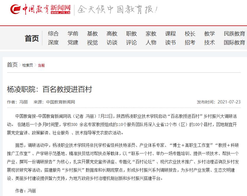 中国教育报-中国教育新闻网讯(记者 冯丽)7月22日,陕西杨凌职业技术学院启动“百名教授进百村”乡村振兴大调研活动。 在随后一个多月时间里,学校300 余名专家教授组成的110个服务团队将深入全省12个市(区)的100个县村,因地制宜开展党史宣讲、政策解读、社会服务 、技术指导等支农助农活动。