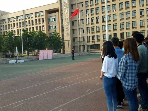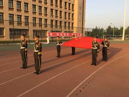 6:40分,国旗班的旗手们着装整齐,迈着矫健的步伐,护着鲜艳的五星红旗入场举行升旗仪式。伴随着雄壮的《义勇军进行曲》的响起,分院全体师生共唱国歌、行注目礼。