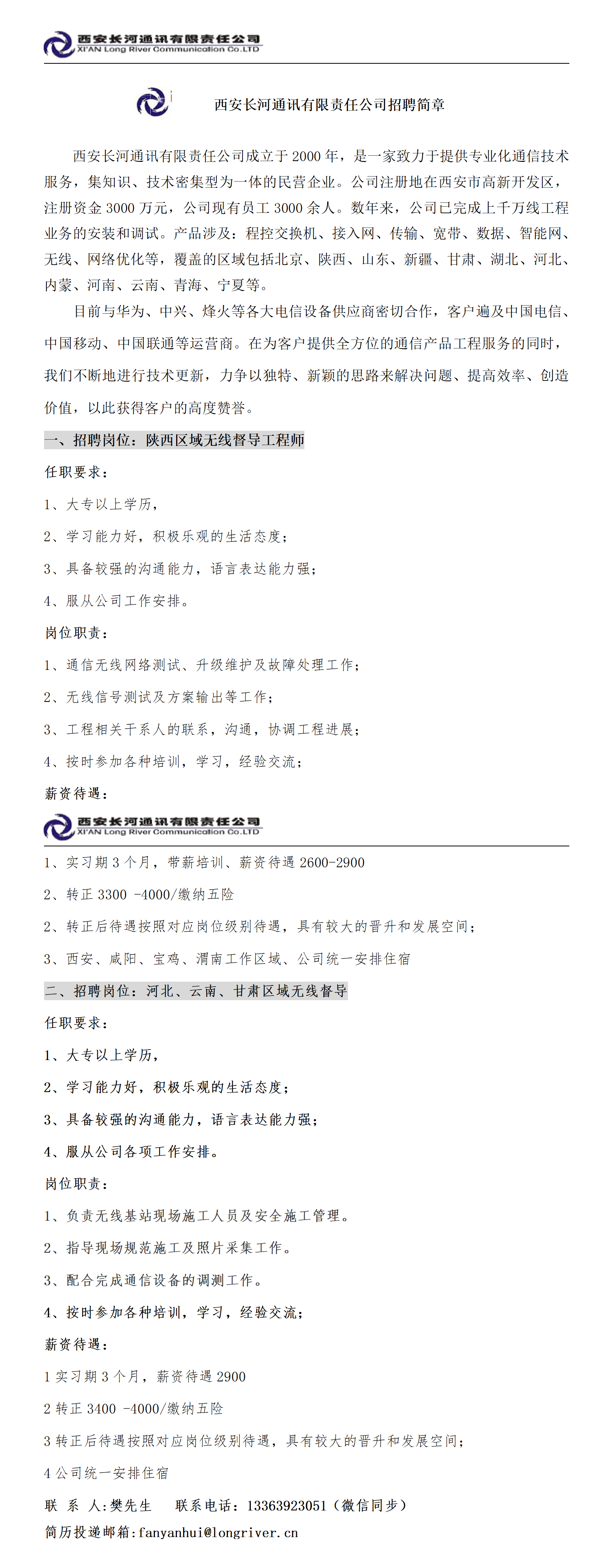 【招聘信息】西安长河通讯有限责任公司招聘简章