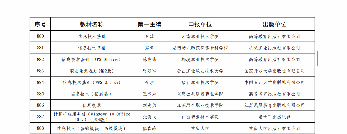 近日,教育部办公厅正式公布了第二批“十四五”职业教育国家规划教材书目名单。由我院陈高锋教授担任主编的教材《信息技术基础(WPS office)》历经多轮严格评审,成功入选,实现我院在国家级规划教材立项上零的突破。