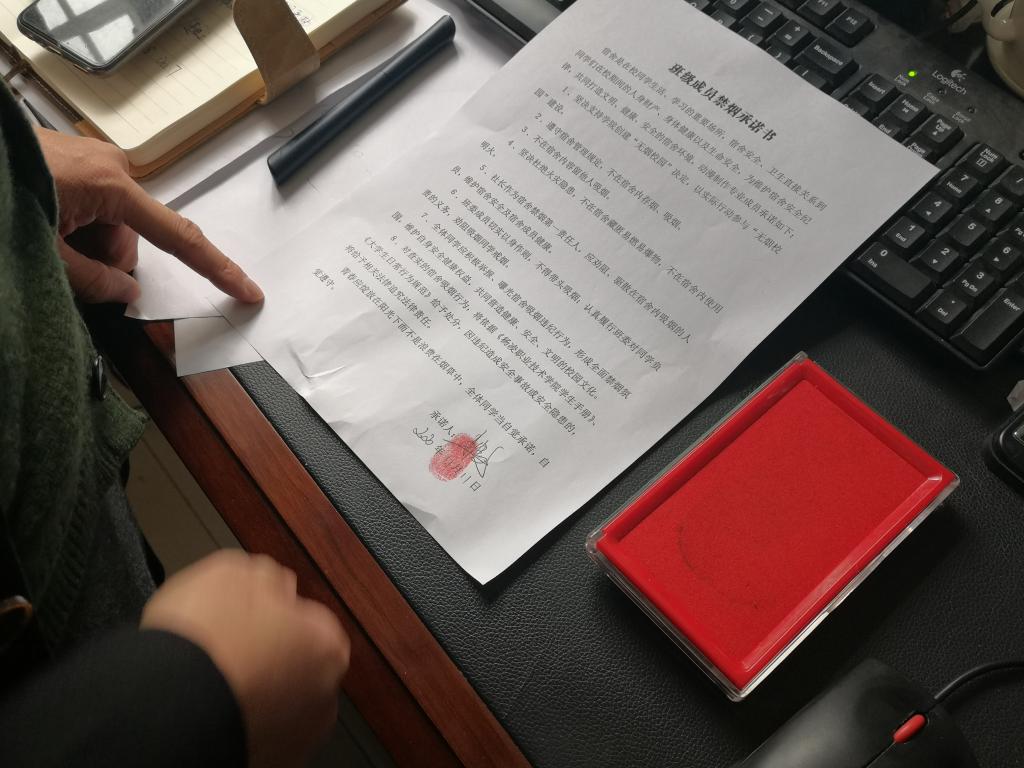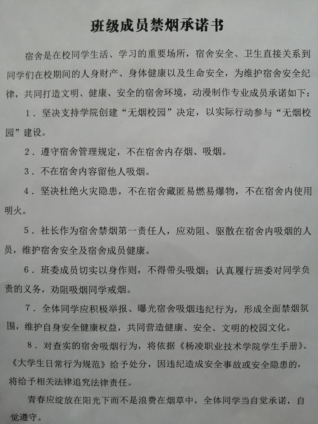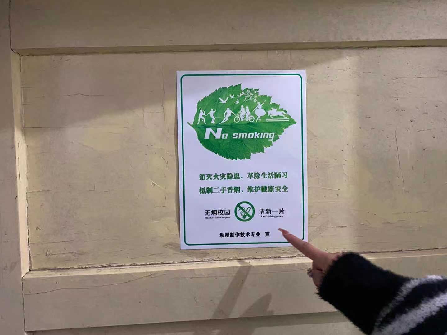 为积极响应学院建设“无烟校园”的号召,以实际行动践行“无烟校园”创建,信息工程分院动漫制作技术专业于近日召开禁烟主题教育活动。主题教育由师生共同参与,辅导员冉博文老师带头签署承诺并按下手印,全体参会同学也依次签署承诺,并按下手印。同时,还制作了禁烟标识,在动漫制作技术专业宿舍全面张贴。本次禁烟目的在于不仅要坚决遏制并消灭校园吸烟现象,还要坚决维护被迫吸二手烟同学的健康权益,营造出吸烟格格不入,处处不留的绿色校园环境。