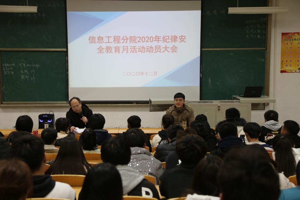 为深化学生安全纪律意识,培养学生自律守纪能力,帮助学生养成良好的行为习惯;同时,也是为了推动校园安全建设,为学生营造良好的学习生活环境,12月7日下午,信息工程分院于醒钟楼一楼会议室举办“2020纪律安全教育月动员大会”活动。本次大会由学工办主任吴高潮老师主持,辅导员张齐老师、信息工程分院各班班长,团支书参加了会议。